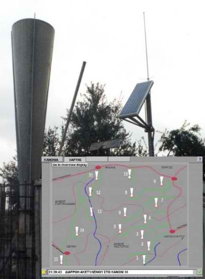 This integrated Automated solution was installed in especially designed sound shooting "guns" (sound waves of pressurized air) triggering the ignition of acetylene gas released by each gun, installed in each of the 94 stations located in agricultural sites throughout Greece. This air wave shoots in the air at 100s of thousands of meters height against any threatening Hail-Bearing cloud. The communication and activation of any one unit occurs wirelessly from the operational Control Centre in real time using telematics. The functionalities and other operational tasks are performed by signals & commands transmitted or exchanged through a network of smart IoT sensors under the supervision of a Scada System and PLC controllers. A high level software engineering suit of programs bundles up the complete solution.
