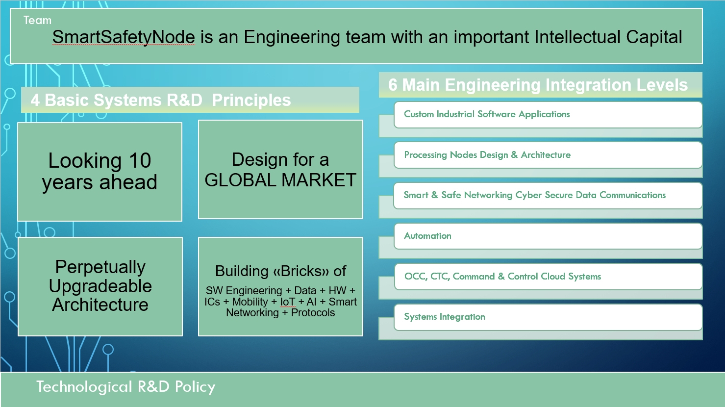 Founders and Governance have a passion for R&D in Technology and their track record is rich of joint venturing in National and European consortia (ESPRIT, PAVE, TELEMATICS, TRANSPORT) together with Engineering or Technological partners to develop innovative and futureproof technologies. This experience produced an important intellectual property capital, exceeding one hundred man-years of R&D.